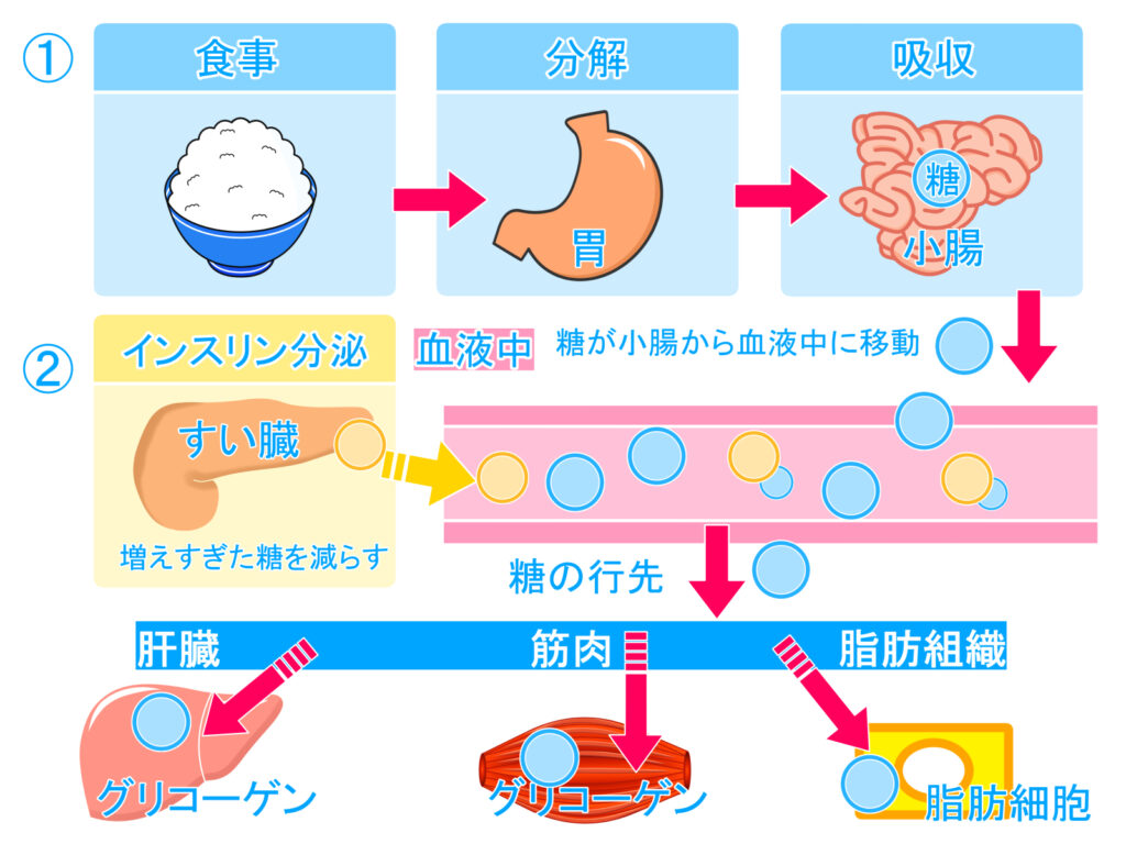 血液中を流れる糖が増えると、膵臓からインスリンが分泌され、は血中から出ていって、筋肉や肝臓、脂肪組織に貯めこまれます。