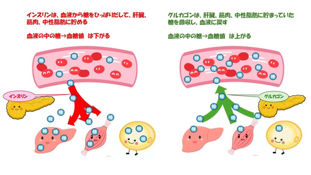 血糖値は主に「インスリン」「グルカゴン」という2つのホルモンのバランスによって巧妙にコントロールされています。