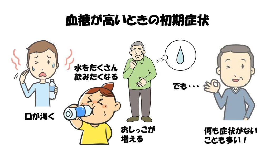 かなりの高血糖の状態でも症状が何も現れず、病気が進むまで気づかないという例も多くあります。