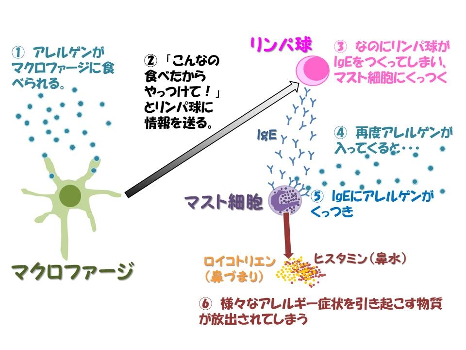 この時に免疫グロブリン(Ig)という物質を作って排除しようとするのですが、IgEというちょっとおバカさん(?)な免疫グロブリンが作られてしまうと、異物の排除だけではなく、内部にたっぷりアレルギー性の炎症を起こす物質を蓄えているマスト細胞という細胞に、その内部の物質(ヒスタミンなど)を放出するように働きかけてしまい脱顆粒と言います)、放出された物質によりさまざまなアレルギー症状を引き起こしてしまいます。