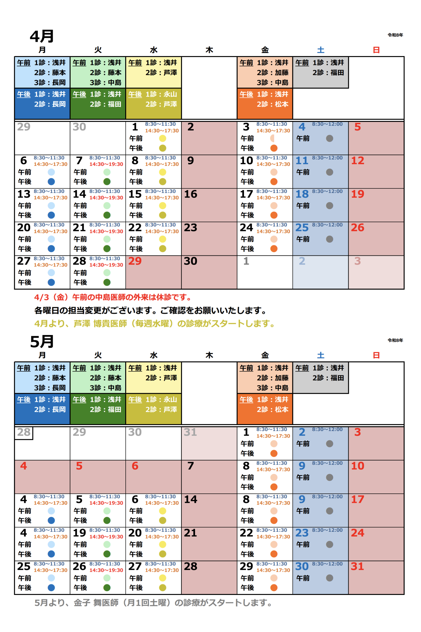 4月・5月の診療カレンダーを更新しました!