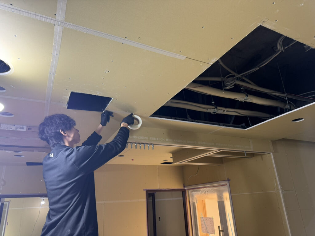今回の現場では、壁紙を貼る前に必要な「下準備」を進めています。