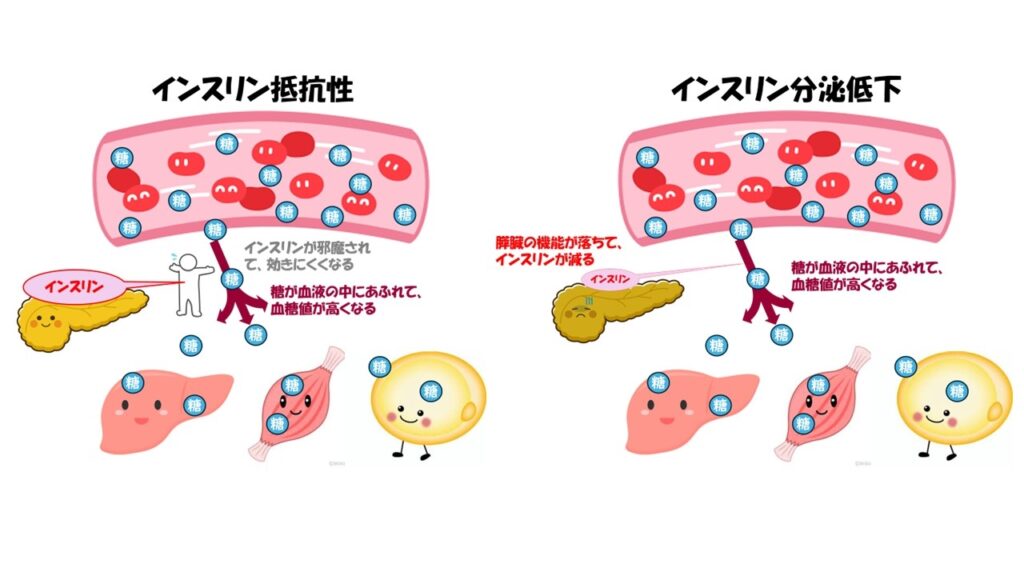 その原因は大きく分けて2つあり、「インスリンの量が減る」時と、「インスリンの効きが悪くなる場合」です。