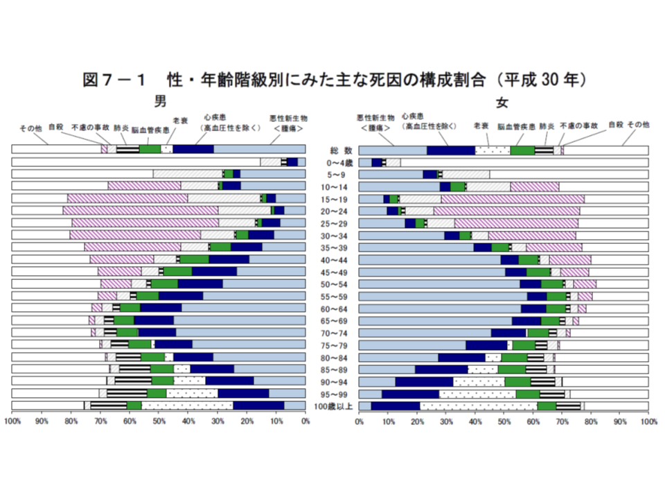 やはり細菌性肺炎は高齢者が圧倒的に多く、65-84歳ではガン、心臓疾患、脳卒中に次いで4位、85-89歳では脳卒中を抜いて3位、さらには90歳以上では以上の死因ではガンを抜いて2位になります。なお90歳以上の男性では死因のNO.1を占めています。
